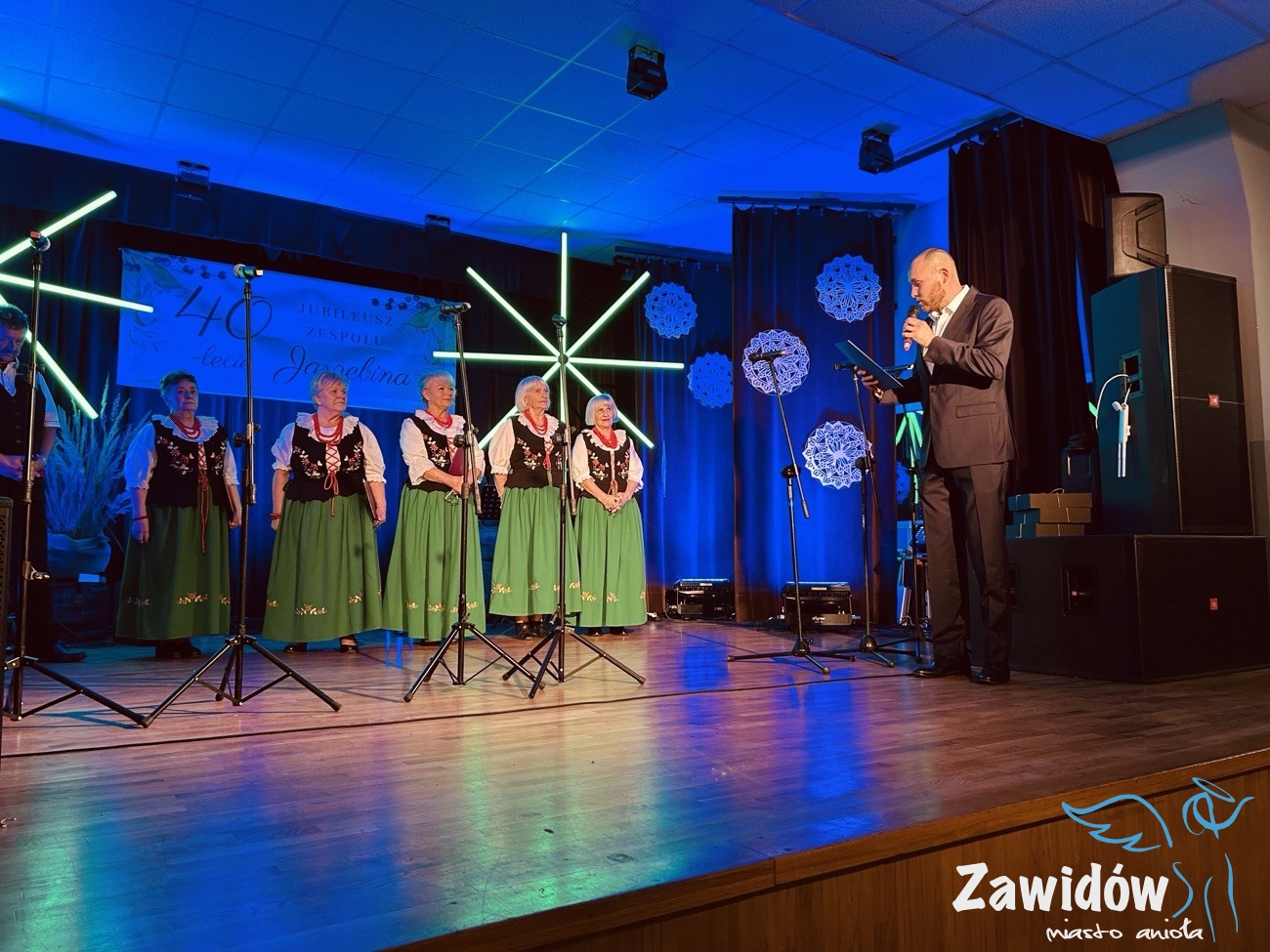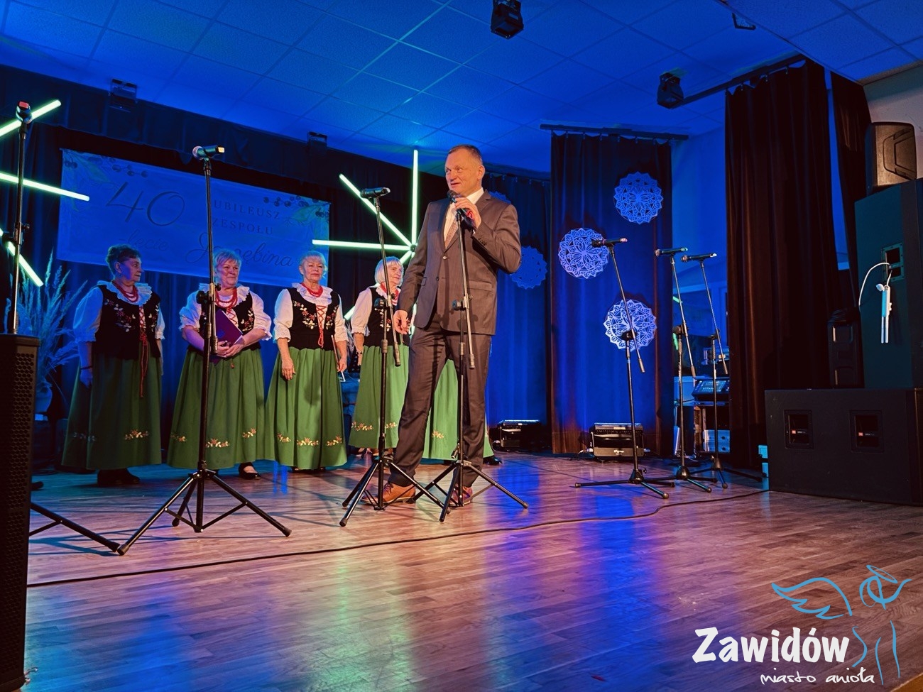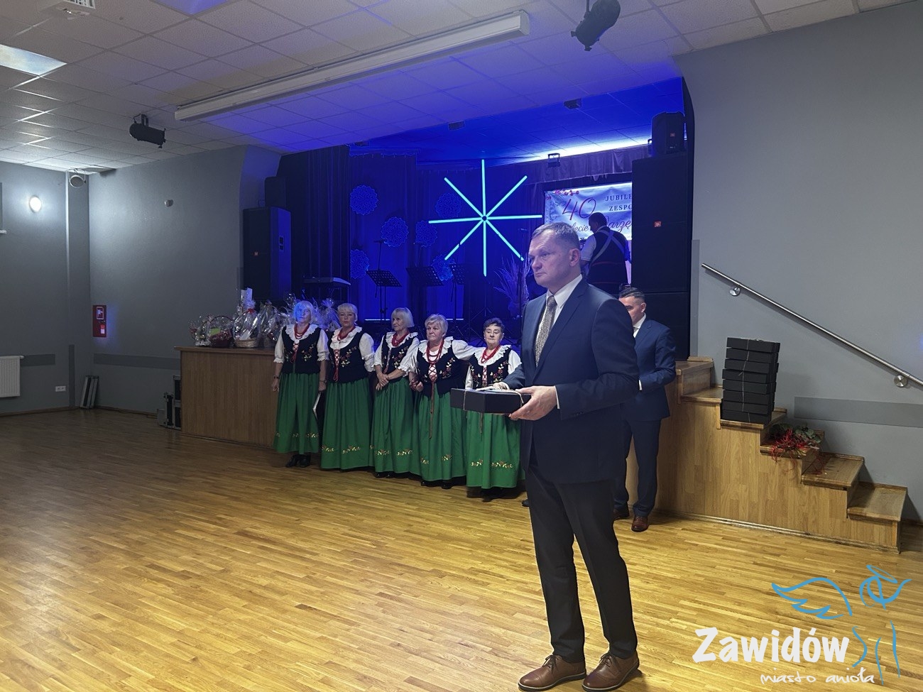 Słowa uznania i wdzięczności za wieloletnią działalność artystyczną skierował do zespołu również Dyrektor Ośrodka Kultury, Konrad Tkaczyk. Podkreślił, że „Jarzębina” od czterech dekad wzbogaca życie kulturalne Zawidowa i skutecznie promuje lokalne tradycje. W dowód uznania wręczył Jubilatom pamiątkową statuetkę oraz wyjątkowy prezent, symbolicznie podkreślając ich dorobek i zaangażowanie.
