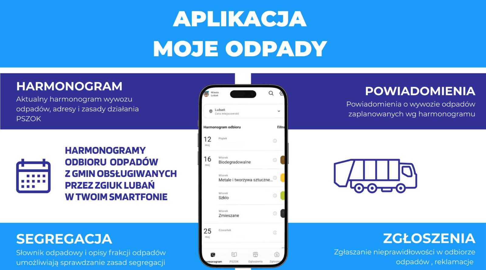 Zakład Gospodarki i Usług Komunalnych w Lubaniu informuje o uruchomieniu nowego, bezpłatnego rozwiązania dla mieszkańców – aplikacji mobilnej „Moje Odpady”. To nowoczesne, przejrzyste i intuicyjne narzędzie, które w znaczący sposób ułatwia dostęp do informacji związanych z gospodarką odpadami.